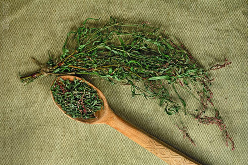 將淡竹葉和辣蓼葉放入榨汁機中榨汁,或者是搗碎,用干凈棉布過濾掉藥渣,備用。