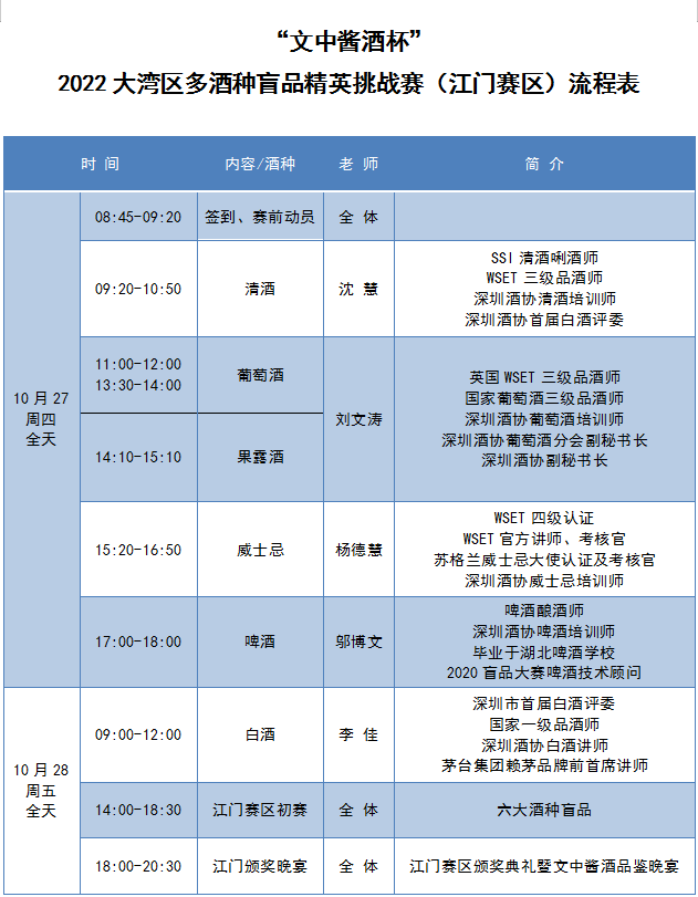 經過六種酒類的培訓。比賽將于2022年10月28日下午兩點正式開始。提前預祝各位江門的參賽選手保持良好發揮、取得優異的成績。