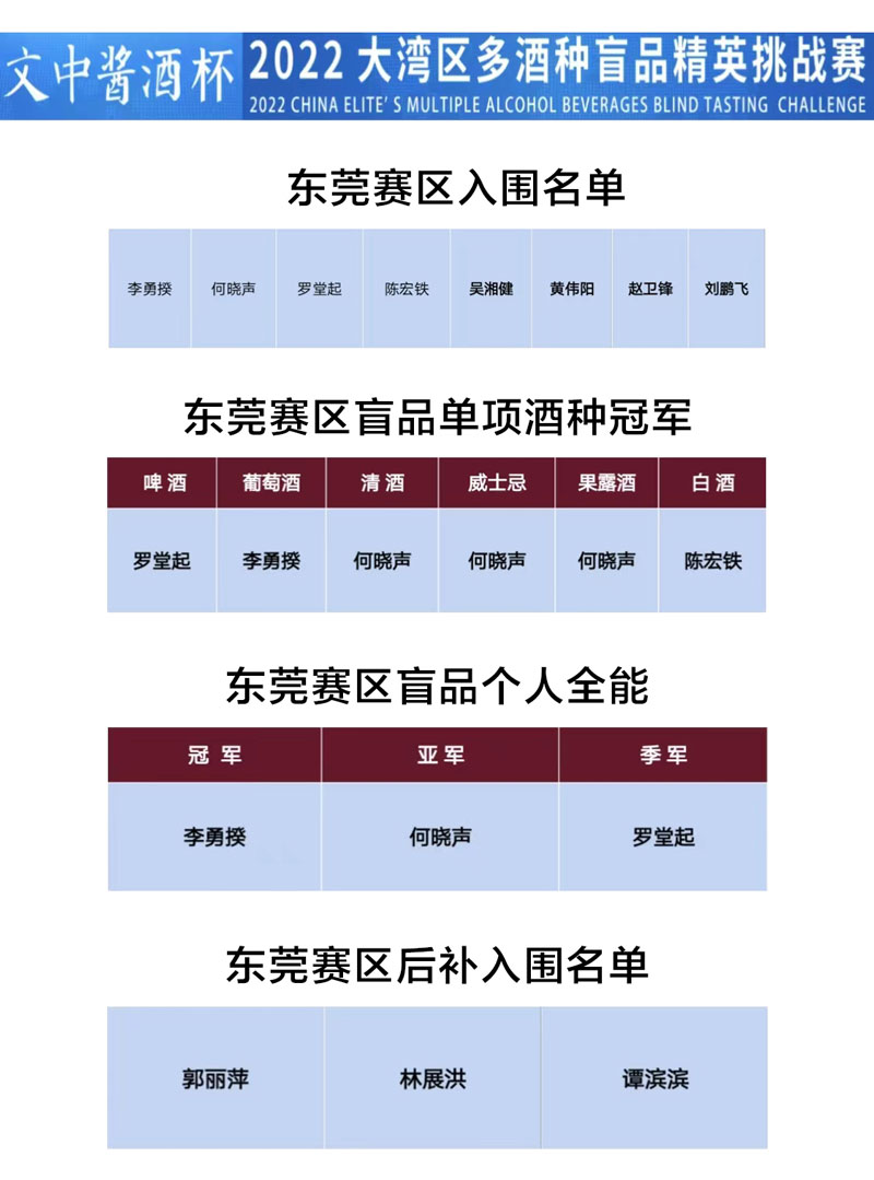 東莞賽區(qū)的成功舉辦,將為即將在深圳舉行的“文中醬酒杯”2022大灣區(qū)多酒種盲品精英挑戰(zhàn)賽總決賽增光添彩,也將提高“國際花園城市”——東莞在酒類行業(yè)的影響力!成為推動我國的制酒業(yè)、酒類銷售與世界融合,共同發(fā)展又一橋頭堡!